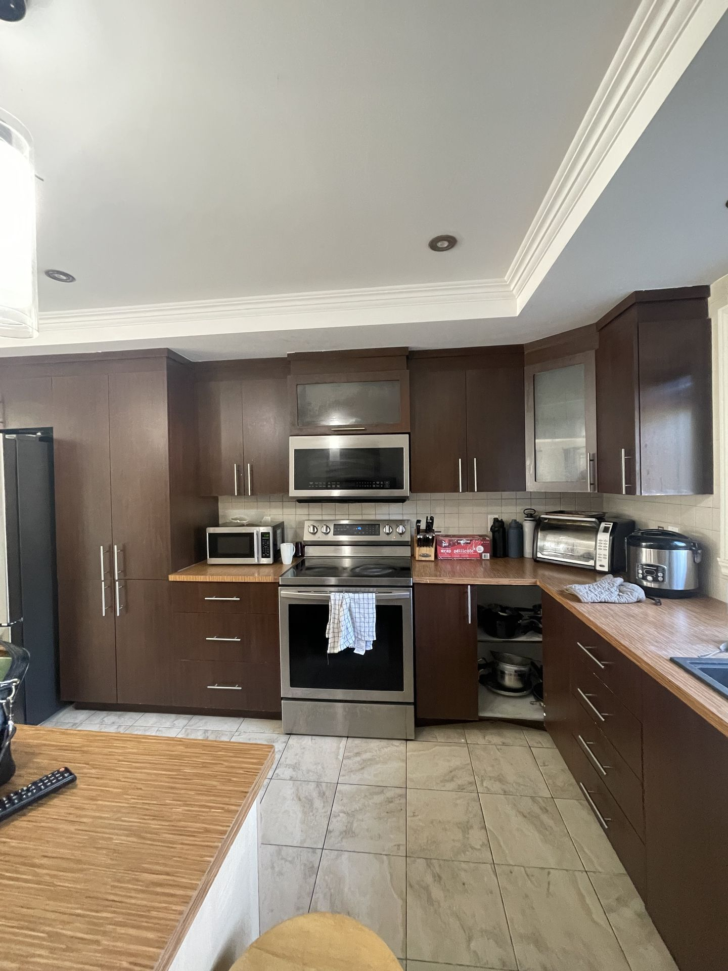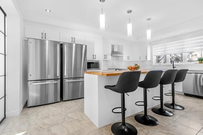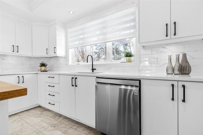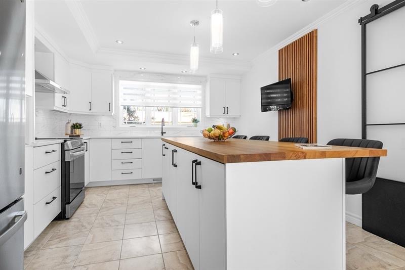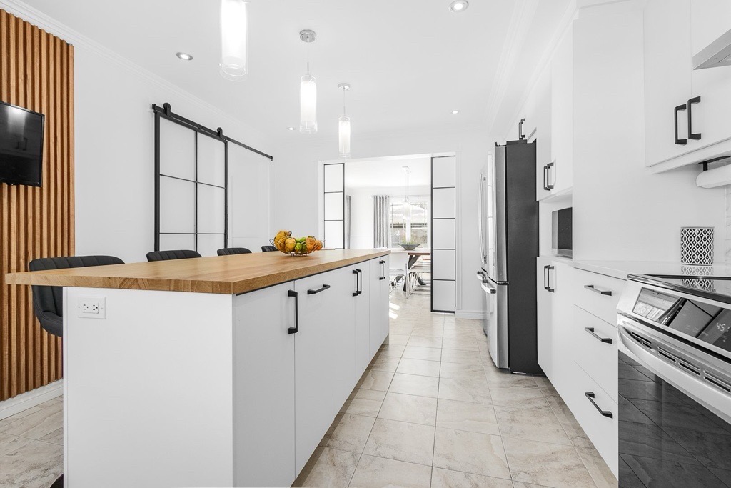 Cette cuisine a été entièrement revitalisée grâce à un resurfaçage complet des surfaces, offrant un look moderne et lumineux. Les comptoirs ont été remplacés par du quartz, ajoutant élégance et durabilité. L’évier, la robinetterie et les poignées ont également été renouvelés pour harmoniser l’ensemble. De plus, de nouveaux accessoires ont été intégrés afin d’optimiser la fonctionnalité des armoires et d’améliorer l’expérience au quotidien.